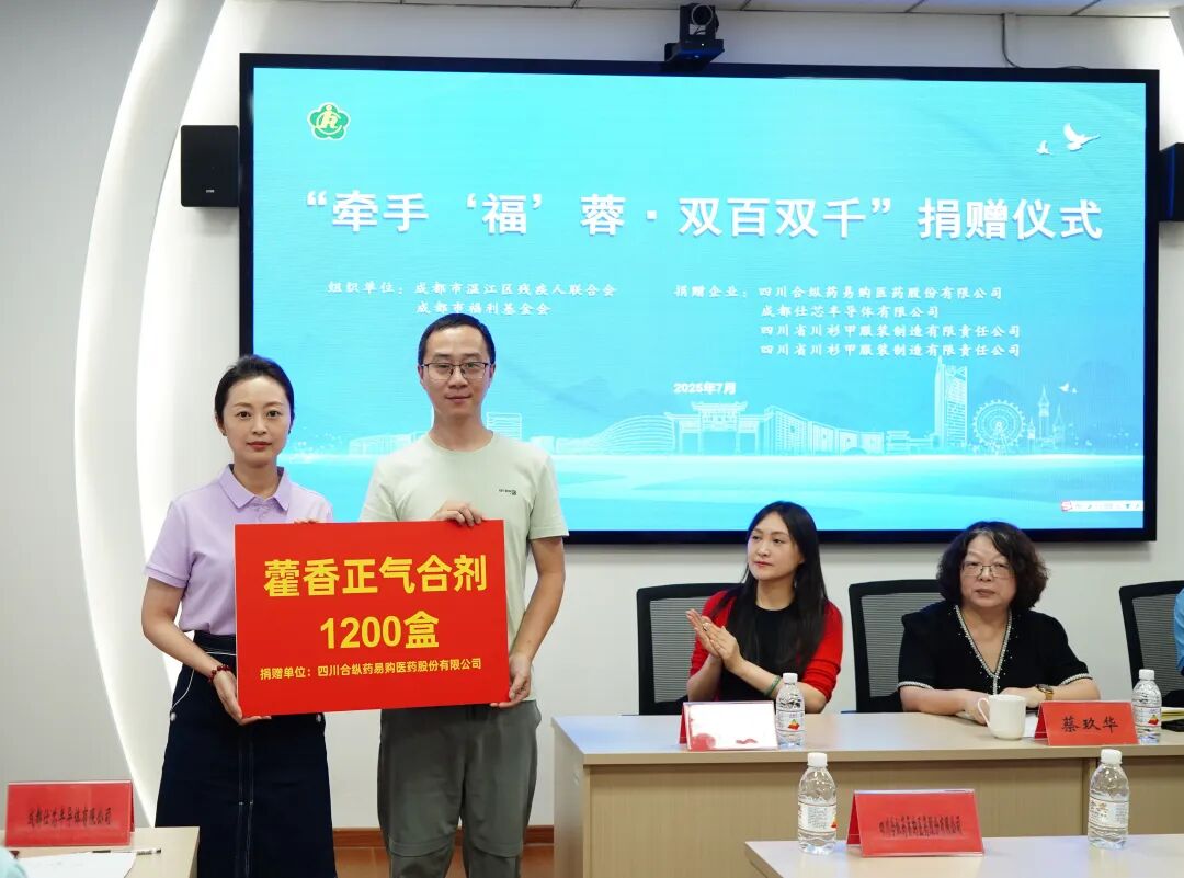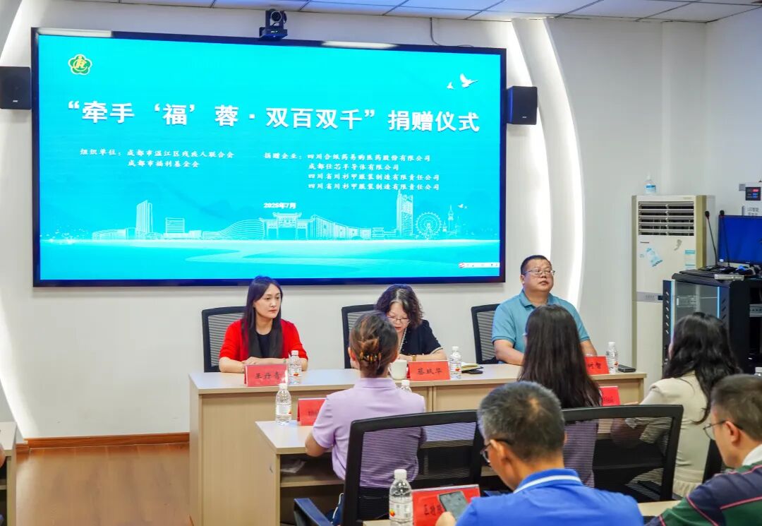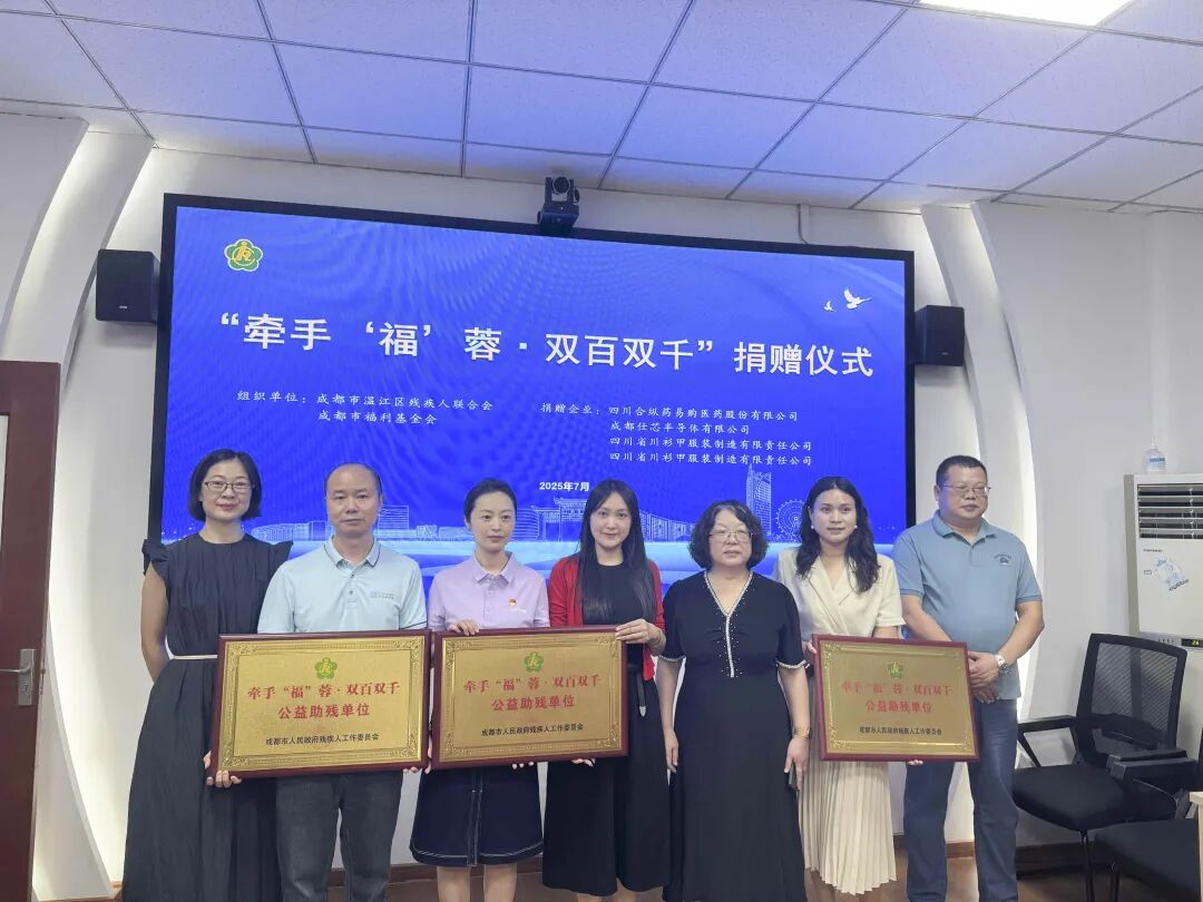 在骄阳似火的七月,一场爱心涌动的活动为温江区的残疾人群体带来了丝丝凉意。2025 年 7 月 25 日上午 9:30,由温江区残联、成都市残疾人福利基金会携手四川合纵药易购医药股份有限公司、成都仕芯半导体有限公司、四川省川衫甲服装制造有限责任公司等爱心企业共同举办的牵手 “福” 蓉・双百双千 “夏季送清凉” 捐赠仪式,在温江区残疾人综合服务中心温情上演。