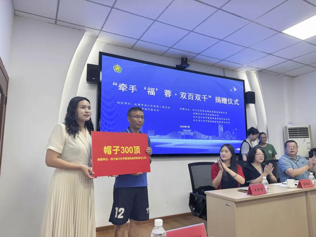 四川省川衫甲服装制造有限责任公司捐赠了POLO衫800件,四川省残疾人坐排队员代表残疾人运动员和演职人员接受,助力他们在训练与表演中保持舒适;该公司还捐赠了帽子300顶,温江区特殊教育学校代表残疾学生接受,为孩子们在炎炎夏日的出行增添了一份保护。